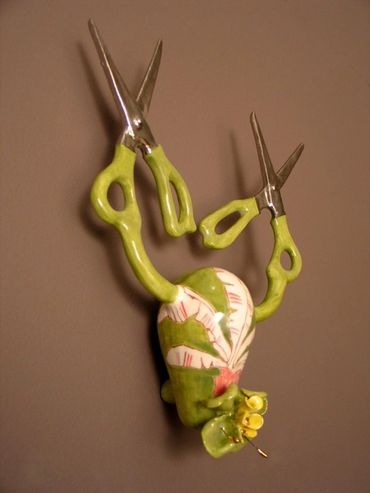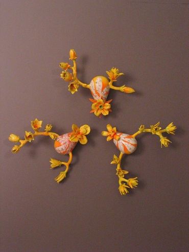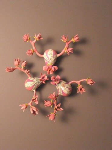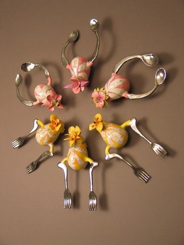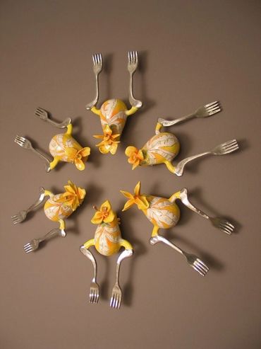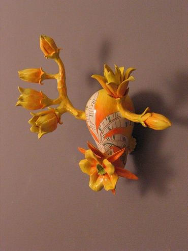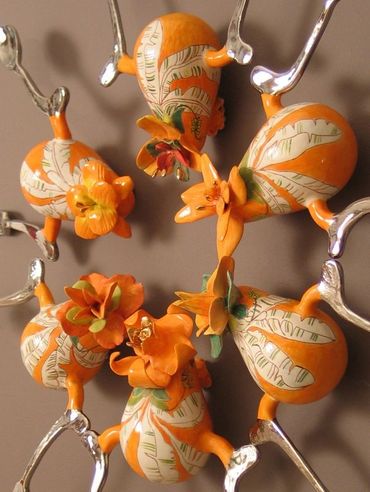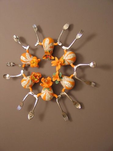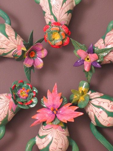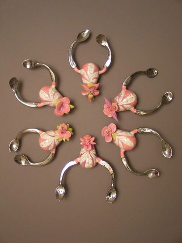 The surfaces pulse with warmth—bright colors, blooming flowers, and curves that evoke both body and blossom. Each ceramic figure is unique, yet connected—like a family, like memories. Installed in a circular formation on the wall, the works form a mandala of care, a constellation of wombs and petals, spoons and forks. The circle becomes a sacred space: a cycle of life, a gesture of unity, a dance of continuity.