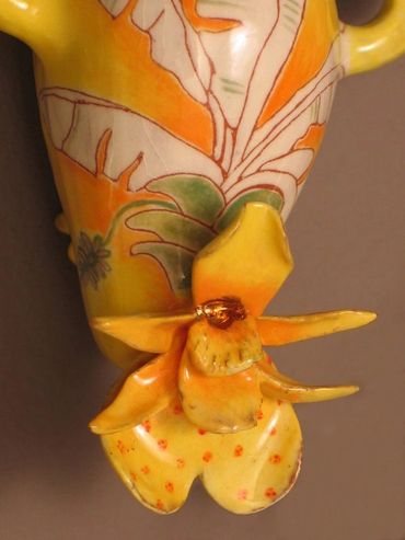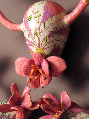 In these sculptural forms, I reimagine the uterus as a sacred vessel—abstracted, stylized, and blooming. It becomes the universe’s first home, the beginning of all life. Around it, I integrate domestic objects not as remnants of labor, but as graceful extensions of a woman’s creative force. Each element is adorned with banana leaves and tropical patterns, echoing Thai folklore, where the banana tree is a symbol of abundance and the gentle generosity of the feminine spirit.